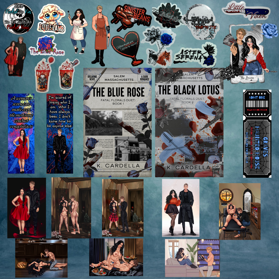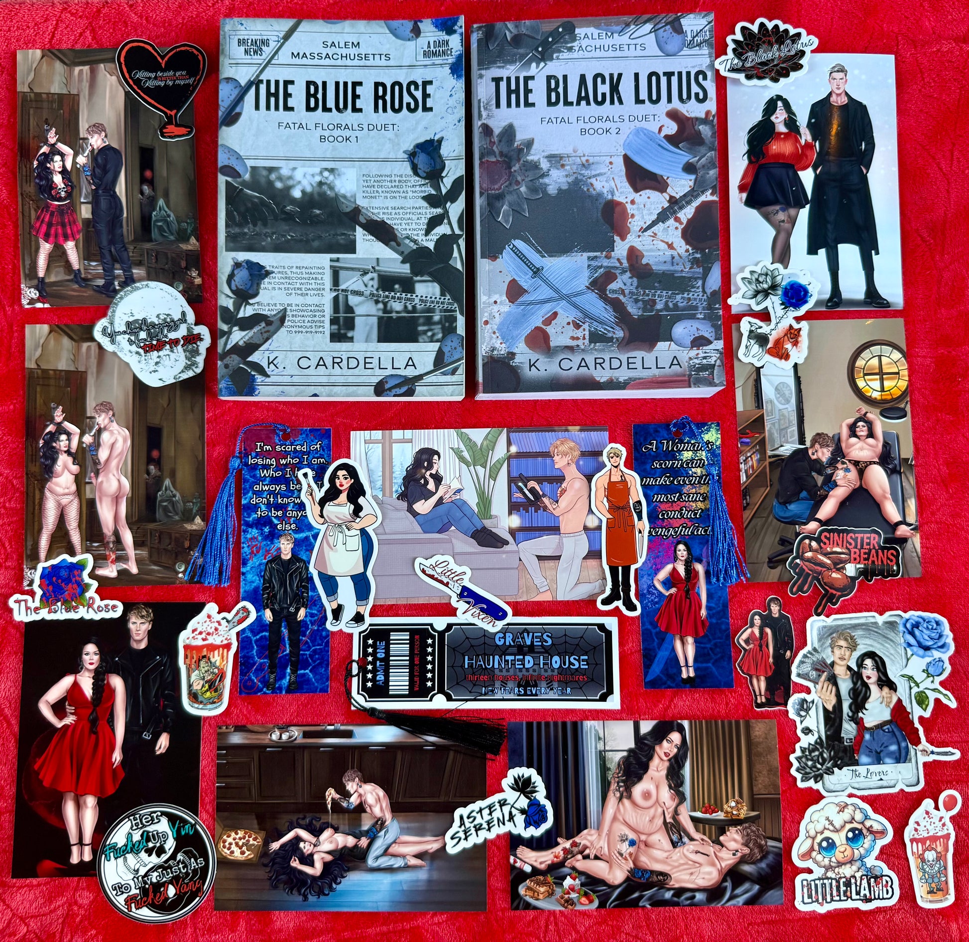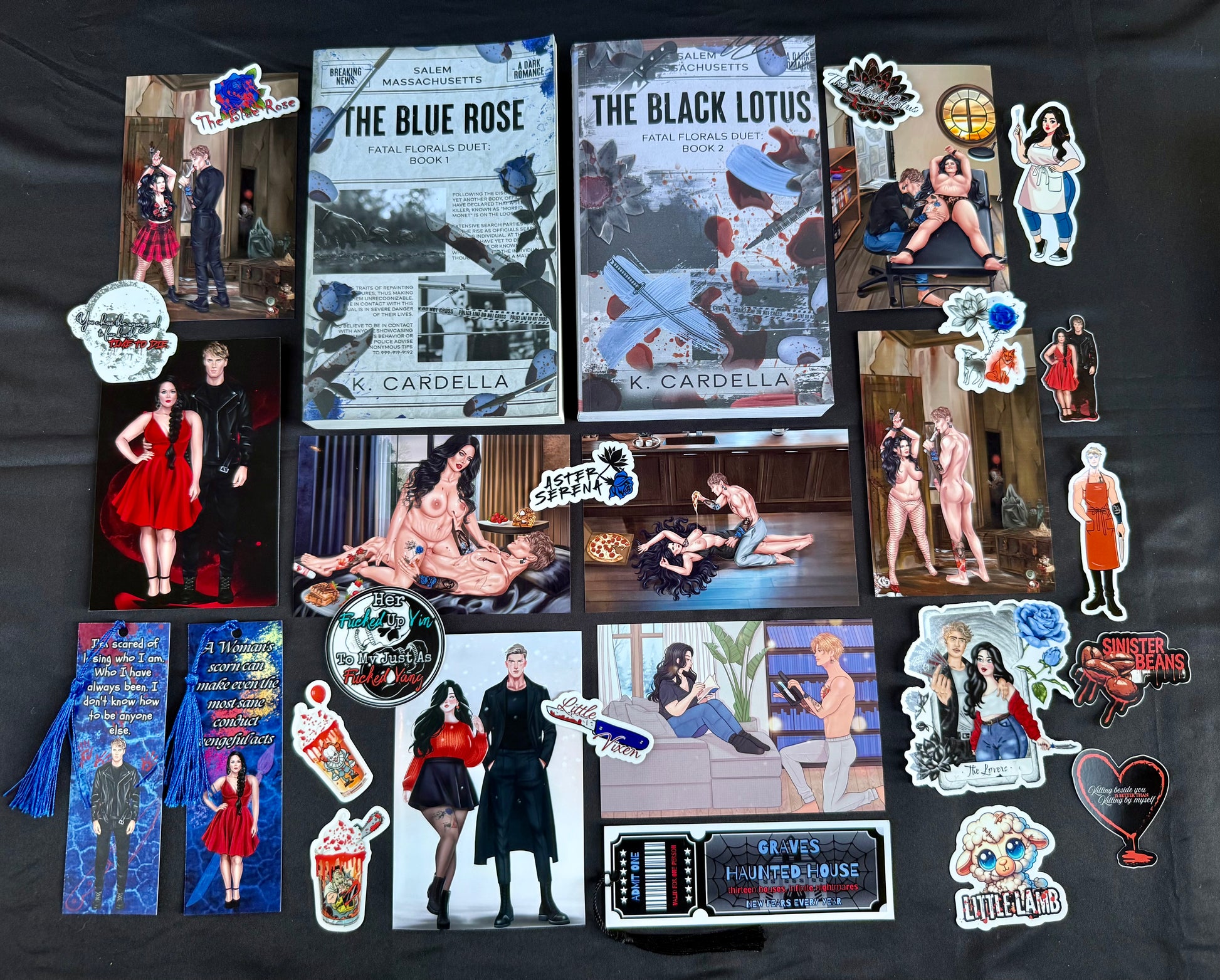 Signed copy of The Blue Rose and The Black Lotus with 3 bookmarks, 8 character art, and 16 custom stickers