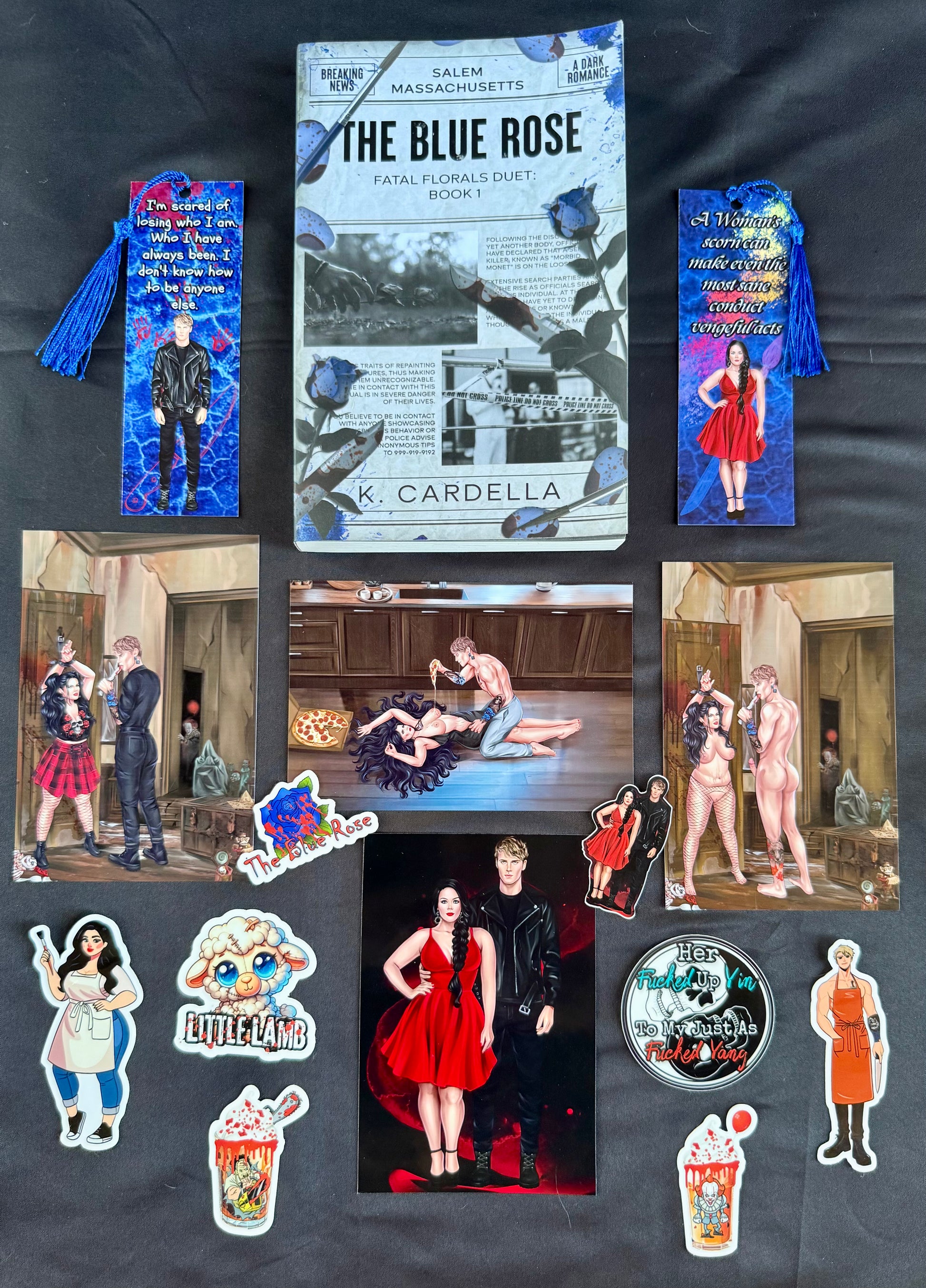 Signed copy of The Blue Rose with 2 bookmarks, 4 character art and 8 custom stickers